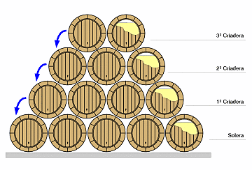 Il Solera è un metodo di invecchiamento ossidativo utilizzato nella tradizione spagnola per invecchiare lo sherry e il brandy. Bisogna creare delle piramidi di 3, 4, 5 piani o ‘Crianzas‘ iniziando a riempire solo le botti più in alto; dopo un anno una parte del contenuto viene travasato nelle botti che si trovano al livello inferiore e quelle superiori vengono riempite con il nuovo vino, ed il procedimento si ripete di anno in anno; in tale maniera il vino che si trova nelle botti alla base (solera, che significa suolo), pronto per il consumo, risulta composto da uve di annate diverse e di anno in anno si arricchisce di particolari sapori. Quindi, 1985 non significa che il vino è del 1985 ma che la Solera è iniziata in quel anno.