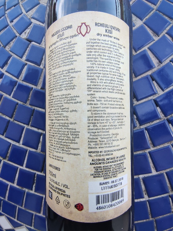 Anno 2000; il vitigno Kisi si trova ad un passo dall’estinzione perché i vignaioli gli preferiscono un più “facile da crescere” Rkatsiteli, ma nel distretto di Telavi non la pensano così e salvano un vitigno che è in grado di offrire vini di grande espressività e finezza. Il nostro Kisi viene proprio da Telavi ed è talmente complesso e in costante evoluzione, che è difficile elencare tutti gli aromi che sfilano sotto il nostro naso e i sapori che deliziano il nostro palato. Albicocche, mele e pere “colorano” il nostro olfatto, bucce di agrumi, fiori bianchi, foglie di tè, miele e noci seguono, erbe aromatiche, spezie gialle, sentori minerali e yogurt si aggregano, e tutti insieme, amorevolmente, compongono un bouquet straordinariamente fine. Al palato, l’esperienza è altrettanto coinvolgente; fragranza, bella freschezza, corpo pieno, tannini maturi e sorso lunghissimo. Un vino davvero eccellente.