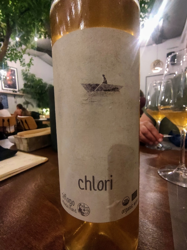 Meno di 600 bottiglie prodotte da uva Chlori, una varietà rarissima coltivata a Lefkada, anche per via della voracità e del buon gusto degli animali selvatici. Una leggera effervescenza introduce un sorso salino e fresco che profuma di albicocche; il tannino, appena percettibile, strada facendo si fa sentire accarezzando il palato, mentre le erbe aromatiche -finora rimaste in secondo/terzo piano- emergono tra i sassi bianchi insieme al cardo asinino e vanno a comporre un bouquet squisitamente “semplice”. Il retrogusto lievemente amarognolo lascia in bocca una sensazione di bellezza “struggente”.