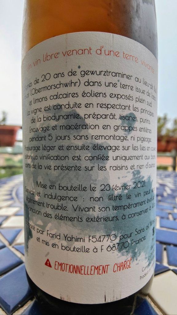 Gewürztraminer bipolare da trattare “con i guanti”. Esordisce composto, equilibrato, con aromaticità, grazia e un sottofondo di musica classica, per poi cominciare ad agitarsi fino ad arrivare al headbanging all’ascolto di musica heavy metal. Inizialmente agrumi, frutta a nocciolo e fiori di sambuco stuzzicano il naso, poi svolta verso sentori erbacei, quasi medicamentosi, spezie, uvetta e frutta cotta. L’iniziale sorriso timido si trasforma in accigliamento e progressiva agitazione, che sorprende e seduce nello stesso tempo. L’acidità spinge sull’acceleratore, il nervo si scopre, il corpo si piazza al centro, solido e energico, e il lungo urlo finale è da brividi. Funky.
