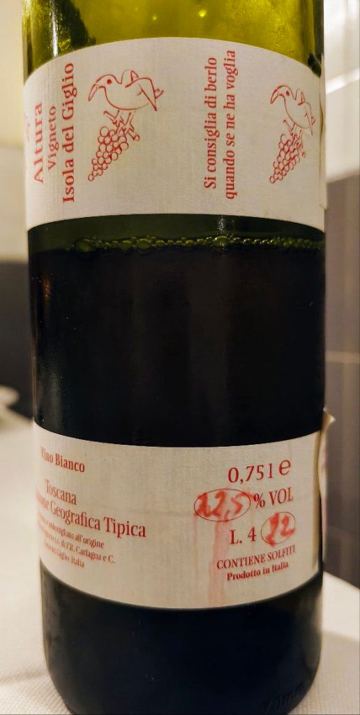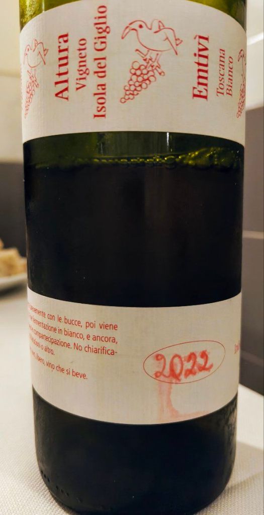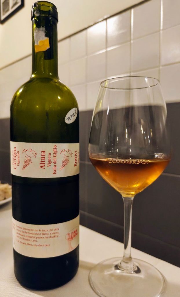 Il tramonto nel calice; è il colore del sole d’estate che si riflette sull’acqua, sul grano maturo, sulla sabbia scaldata dal vento. Una brezza arriva dal mare portando con sé profumi di frutta matura (pesca, albicocca, scorza d’arancia) mescolati a fiori e spezie leggere. Poi arrivano le erbe, la macchia mediterranea e una piacevolissima sensazione salmastra, quel soffio di mare che entra nelle vigne e non se ne va più. Al palato, la consistenza morbida “abbraccia” una vena fresca e sapida che rende il vino vivo, vibrante. La macerazione gli regala una “carezza tannica”, un tocco di carattere che lo accompagna fino alla fine. Le note agrumate e della frutta a nocciolo si combinano armoniosamente con una sottile mineralità e ci regalano un sorso diretto, schietto, con la sapidità che ricorda il sale rimasto sulla pelle dopo un bagno. Il finale è lungo e si porta dietro una nota fresca e agrumata, quasi un addio frizzante e luminoso. Sognante.
