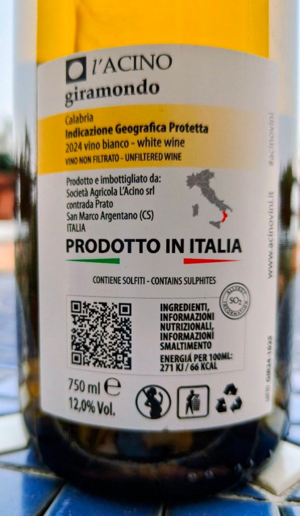 Avvicini il calice al naso e sei altrove; c’è la macchia mediterranea che “brucia” sotto il sole di agosto, la resina dei pini che costeggia la Statale 18, l’aria salmastra che sale dal Tirreno. È asciutto questo vino, asciutto come una pietra calcarea a mezzogiorno, e sprigiona i suoi profumi lentamente; i fiori di biancospino e di acacia, la salvia e il timo, gli agrumi e quella mandorla appena amarognola che riempie i fichi essiccati del Cosentino. Lo assaggi e ti aspetti freschezza.. e la trovi, vivace, immediata, quasi elettrica. Il sorso è stratificato; sale in superficie, poi una profondità minerale quasi rocciosa, e poi una leggerissima tannicità che ti chiede attenzione. Vino genuino che racconta una Calabria ruvida, luminosa, autentica.
